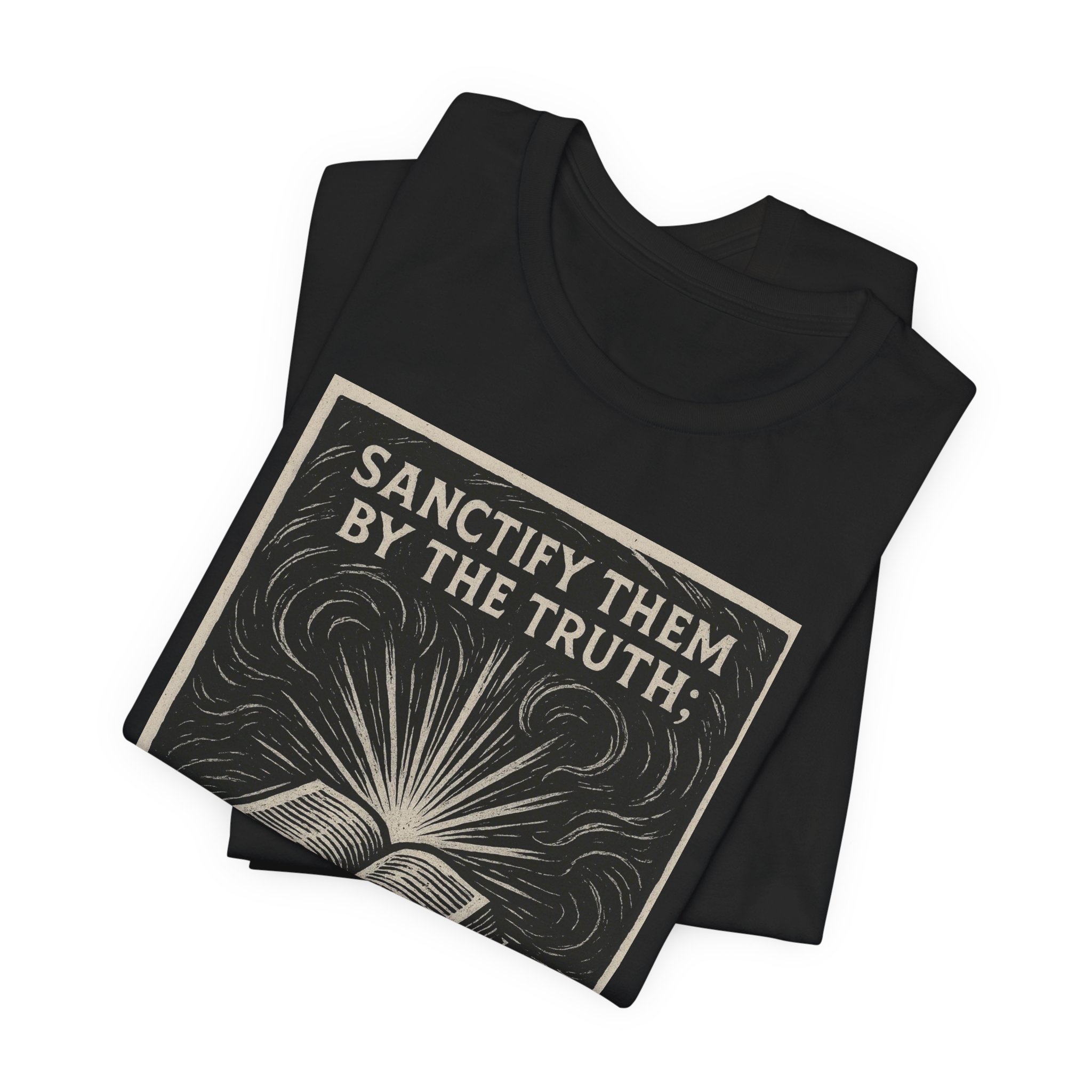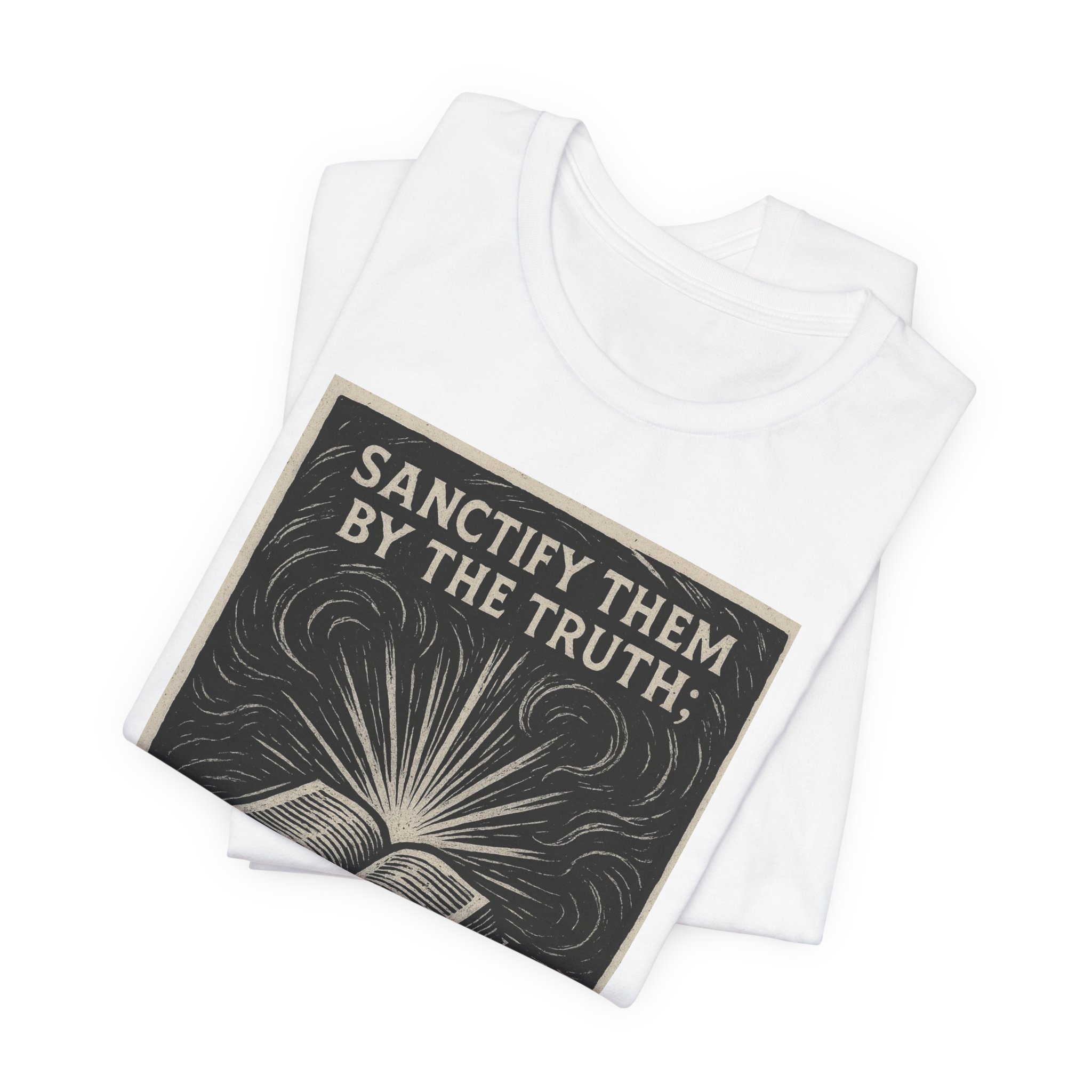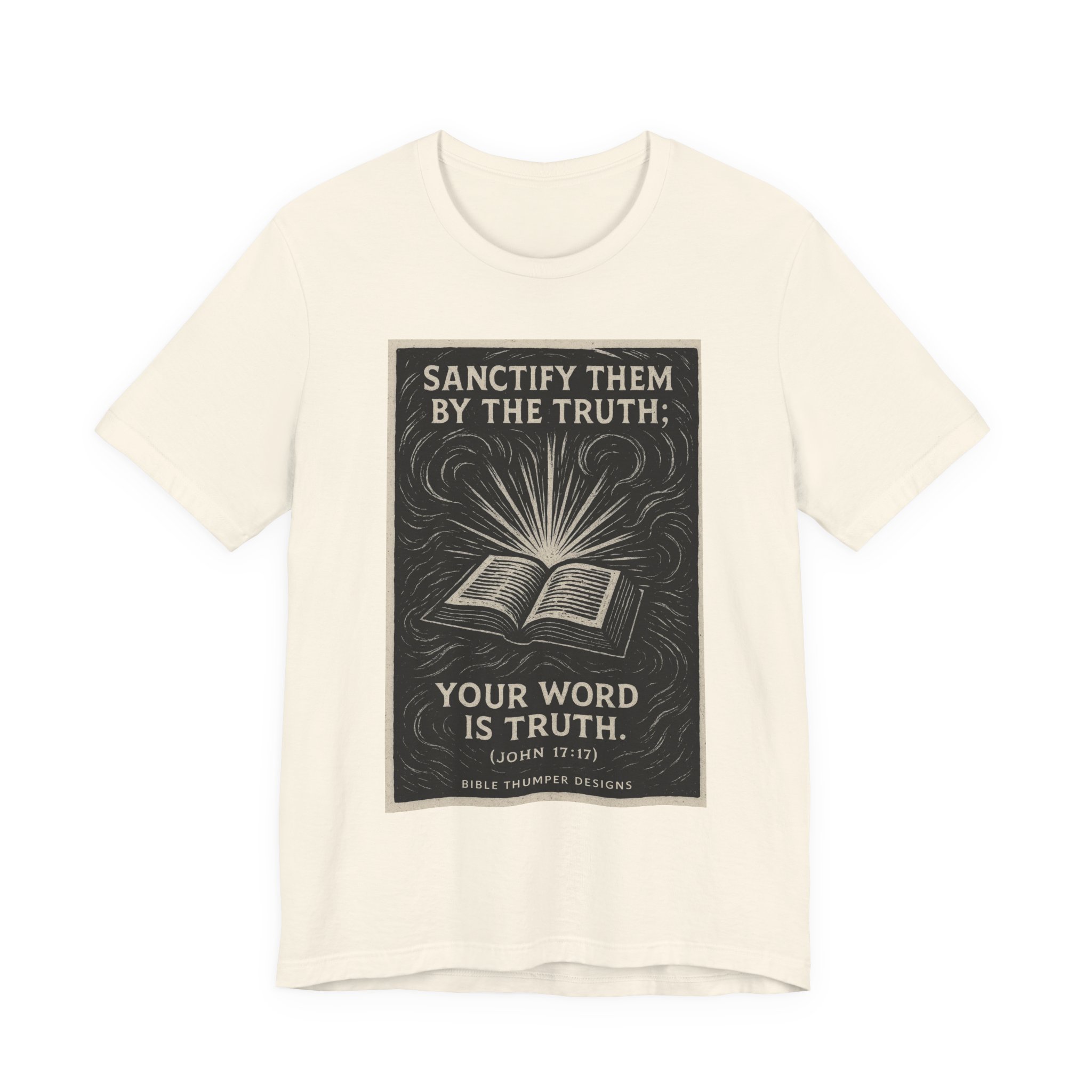 Wear your faith with quiet confidence. This lightweight jersey tee features a chalkboard-style print of an open Bible radiating light and the verse: “Sanctify them by the truth: Your word is truth. (John 17:17).” The muted, vintage-inspired artwork sits centered on a clean white field, making the message clear without shouting. Soft Airlume combed cotton and a retail crew neck give it a neat everyday silhouette you can layer under a sweater or wear on its own to study group, service, or while journaling at your favorite café. The tag is printed to avoid irritation, and sturdy side seams, shoulder tape, and a ribbed collar keep the shape wash after wash. Thoughtful, simple, and reverent—this tee moves with you through worship, service, and quiet moments of reflection.
