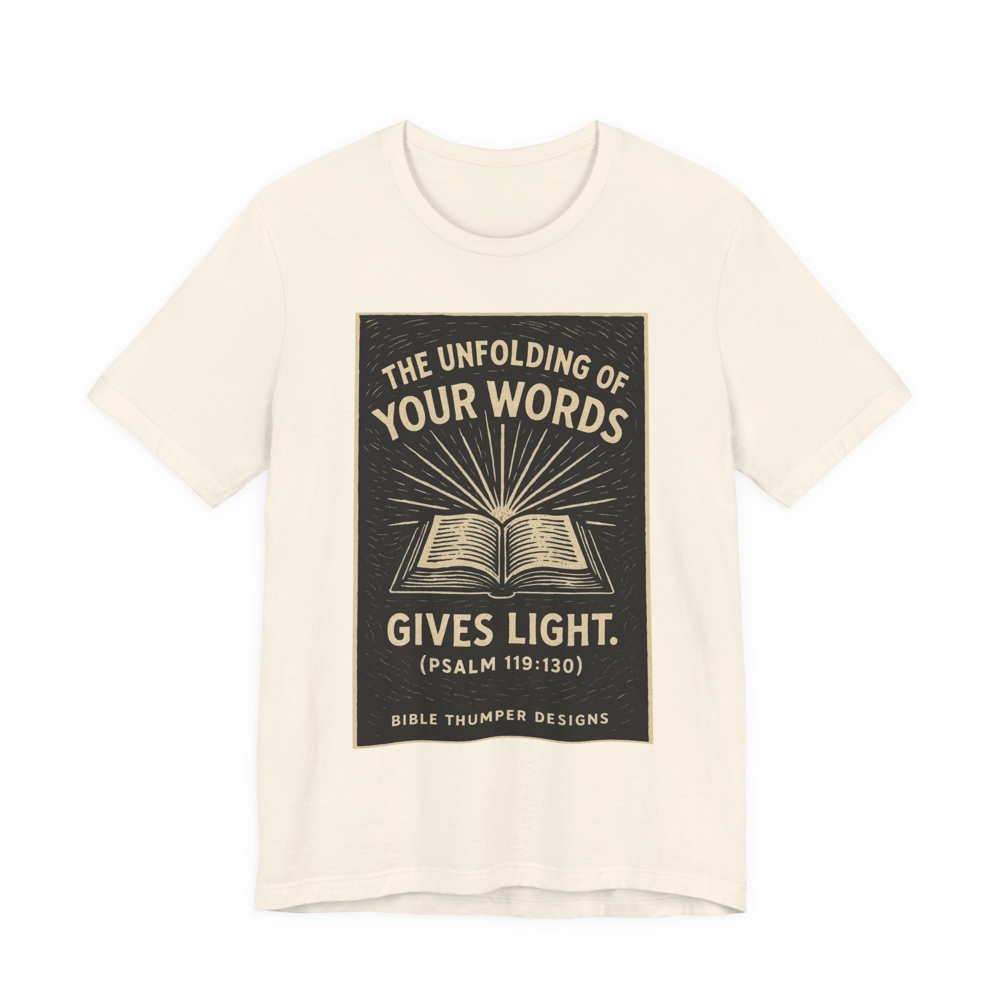 Be the first to review “Bible Verse Tee — “The Unfolding of Your Words Gives Light” Psalm 119:130 Christian T-Shirt”