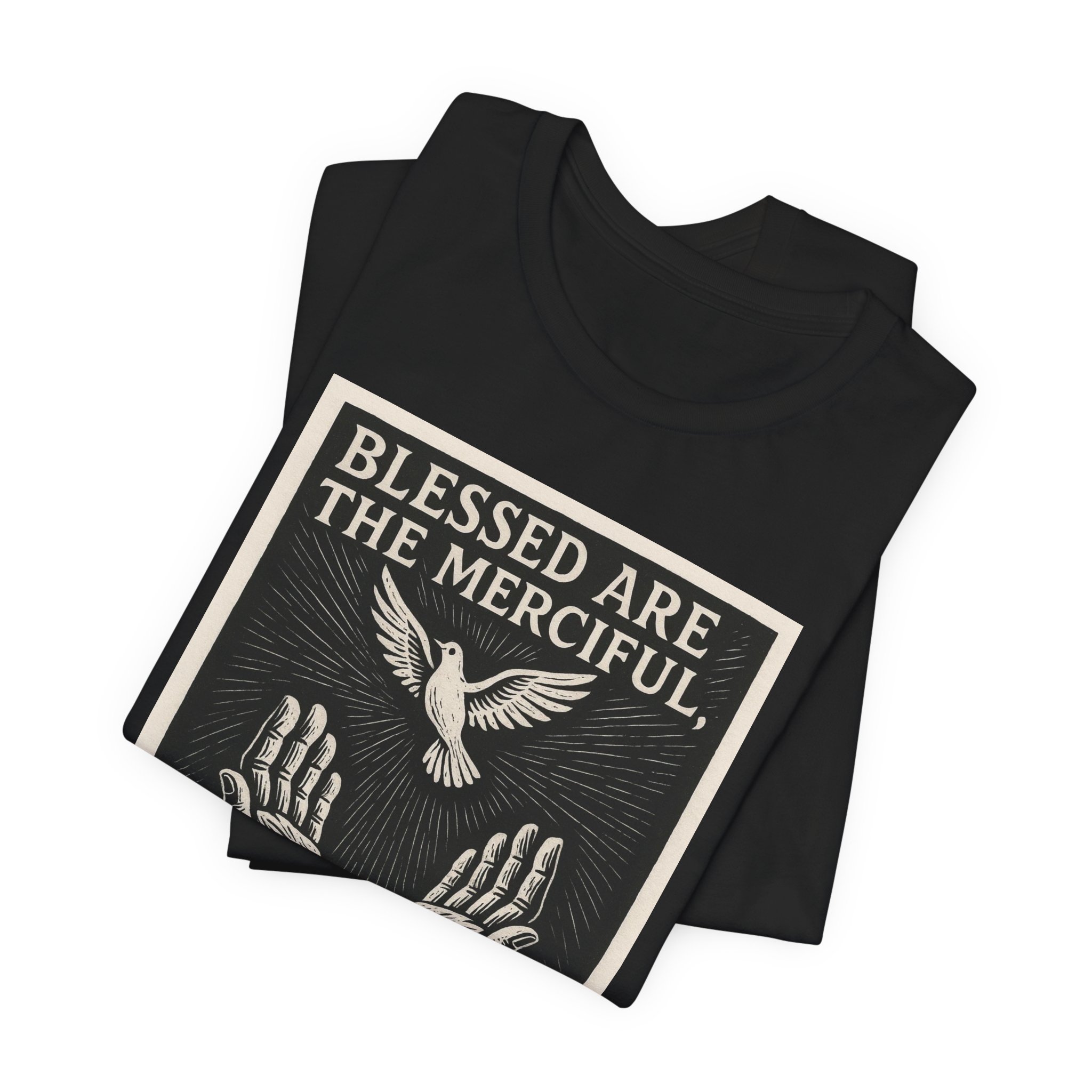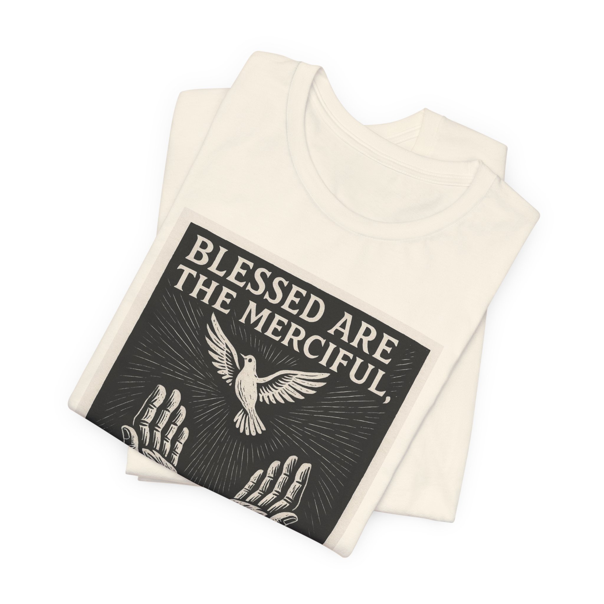 This lightweight cotton tee carries a quiet, reverent message—an artful vintage-style print of open hands and a dove with the scripture, “Blessed are the merciful, for they shall receive mercy” (Matthew 5:7). The soft, trusty fabric and retail fit make it a wearable reminder for faith-centered mornings, casual worship gatherings, or reflective days at home. It layers easily under a jacket or wears alone, holding its shape thanks to thoughtful construction details. Wear it when you want your faith to feel gentle, steady, and seen.