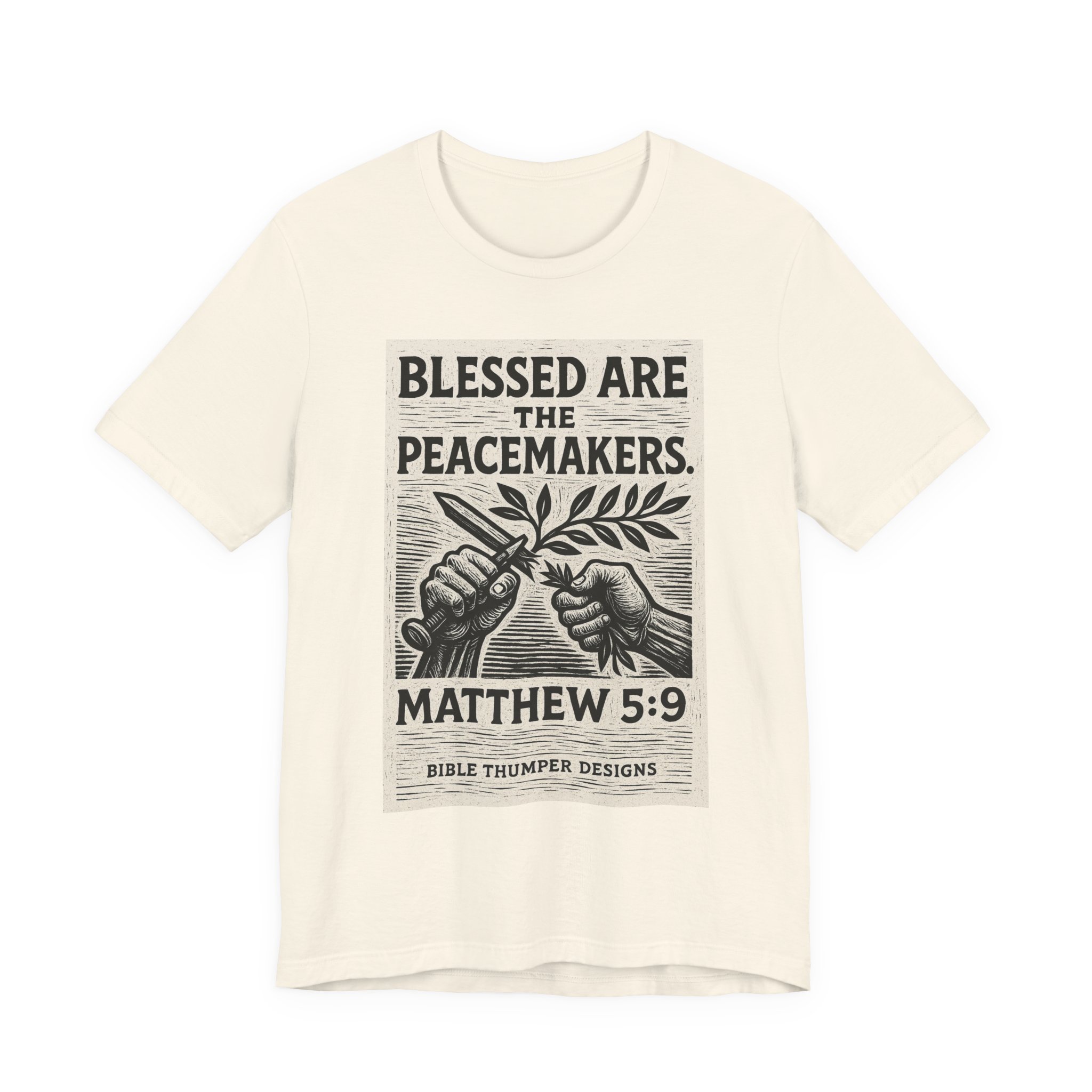 Carry a quiet, confident message wherever you go. This soft, breathable jersey tee features a bold, vintage-style print quoting Matthew 5:9—“Blessed are the peacemakers”—rendered like a woodcut poster with two hands exchanging an olive branch. It sits comfortably against the skin thanks to Airlume combed and ring-spun cotton, a classic crew neck, and a retail cut that layers easily under jackets or wears alone. The understated back keeps focus on the front artwork, so the message reads clear and calm in everyday life—church halls, volunteer days, coffee runs, or slow weekend walks. Thoughtful production details (tear-away label, reinforced collar and shoulder tape, side seams) keep this tee looking and feeling put-together wash after wash.
