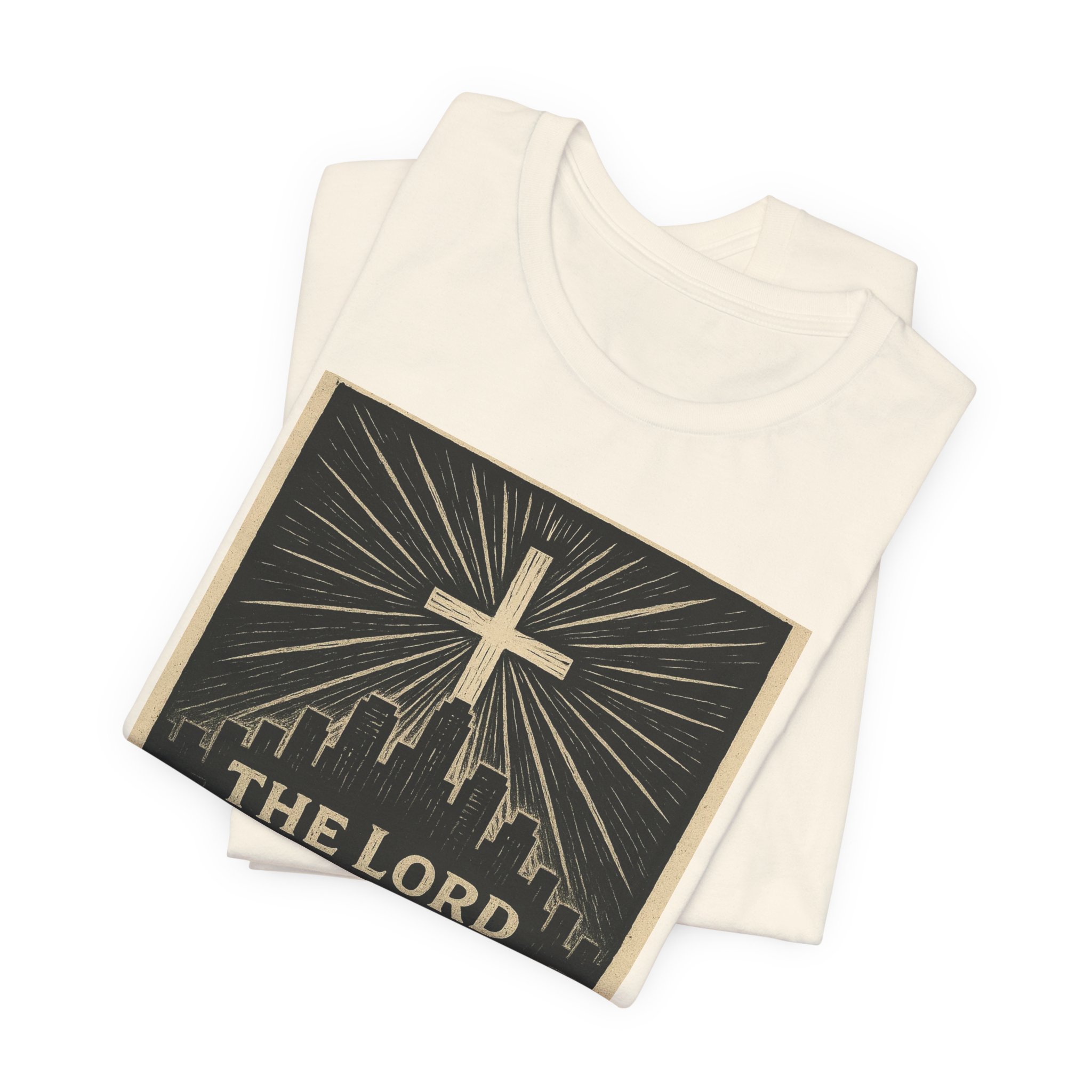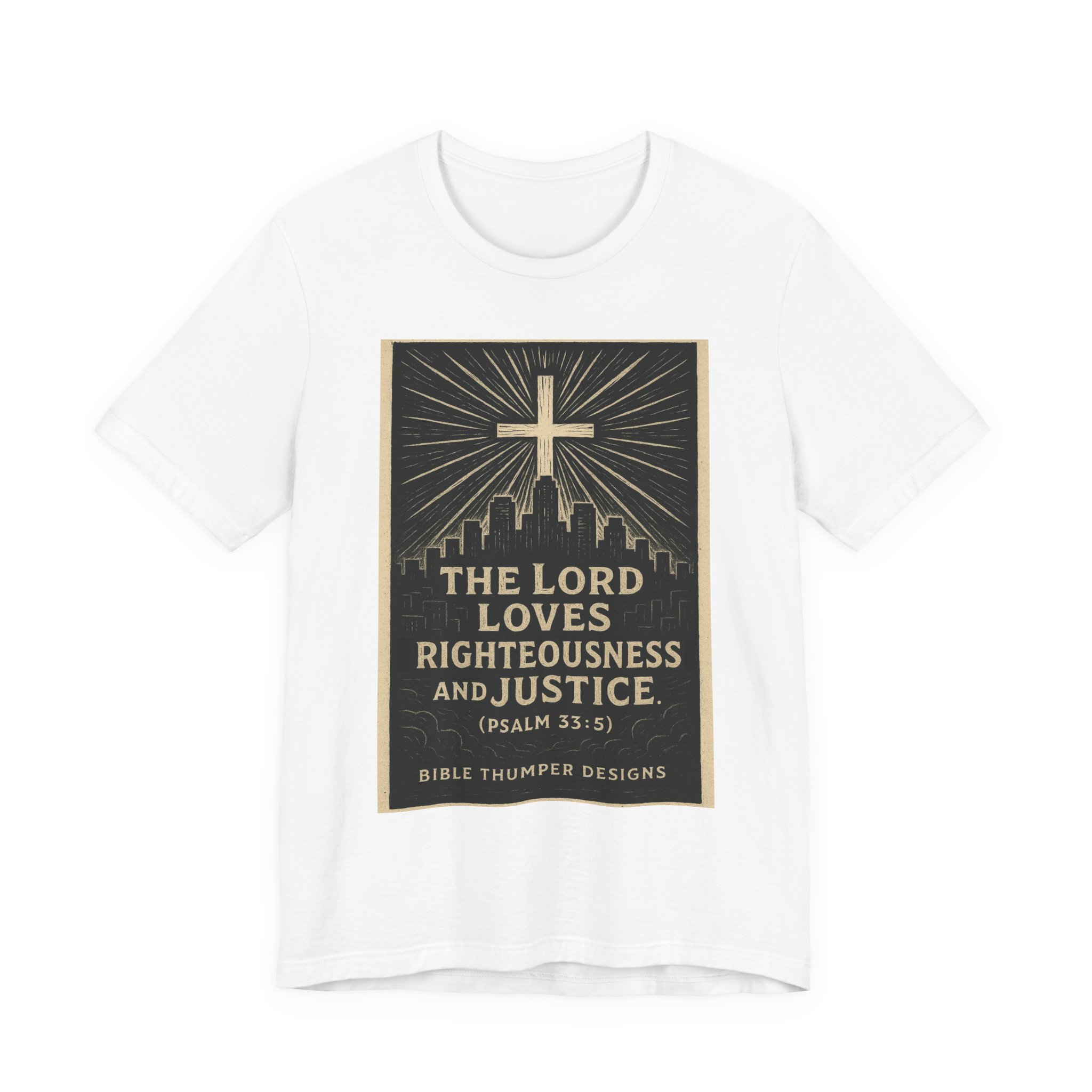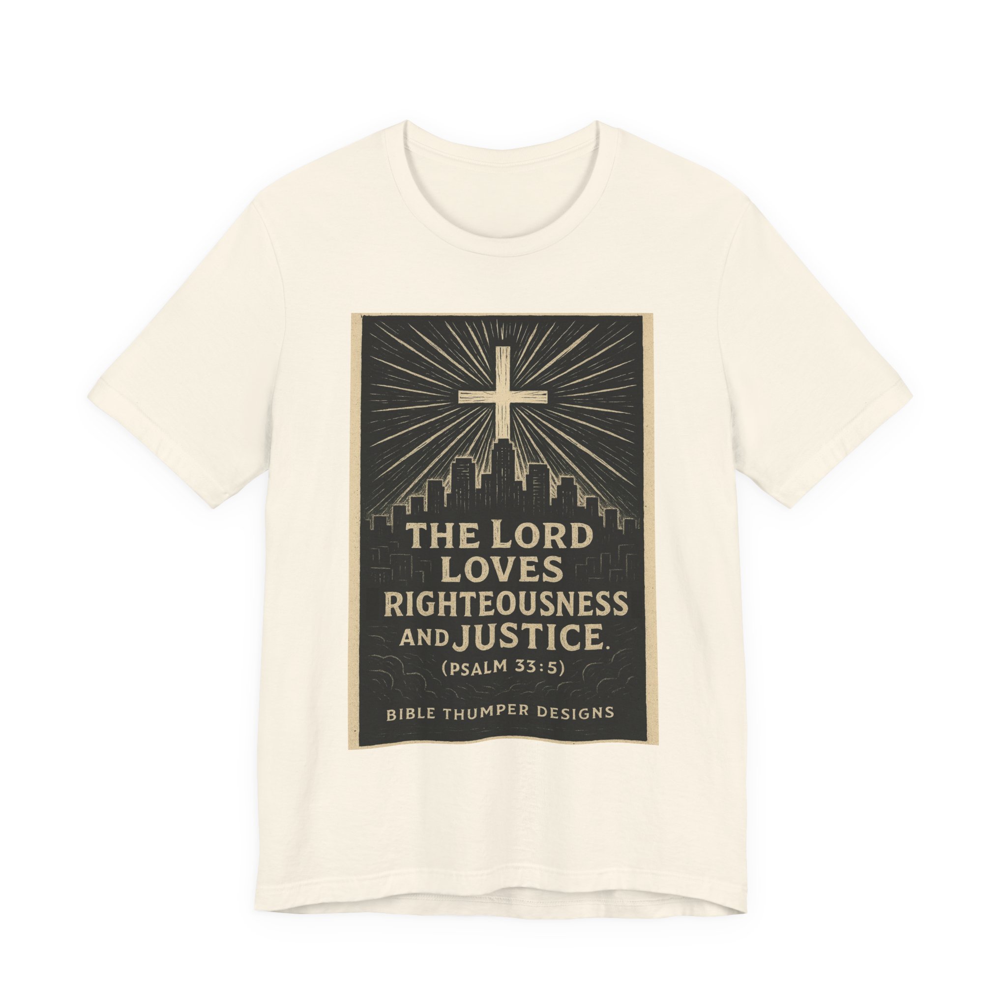 Quiet and steady faith wrapped in a soft, breathable tee. This lightweight jersey shirt carries a bold, vintage-style chapel scene and a radiant cross above the words from Psalm 33:5 — a calm declaration of justice and love you can wear to church, outreach events, or everyday life. The muted gold and charcoal print reads like a treasured poster: respectable, reverent, and made to layer under a cardigan or wear alone on warm mornings. It settles comfortably against skin and keeps its shape through worship, service, and the small routines that matter.
