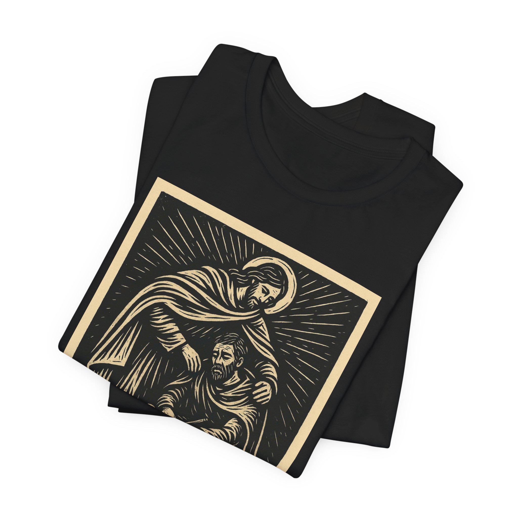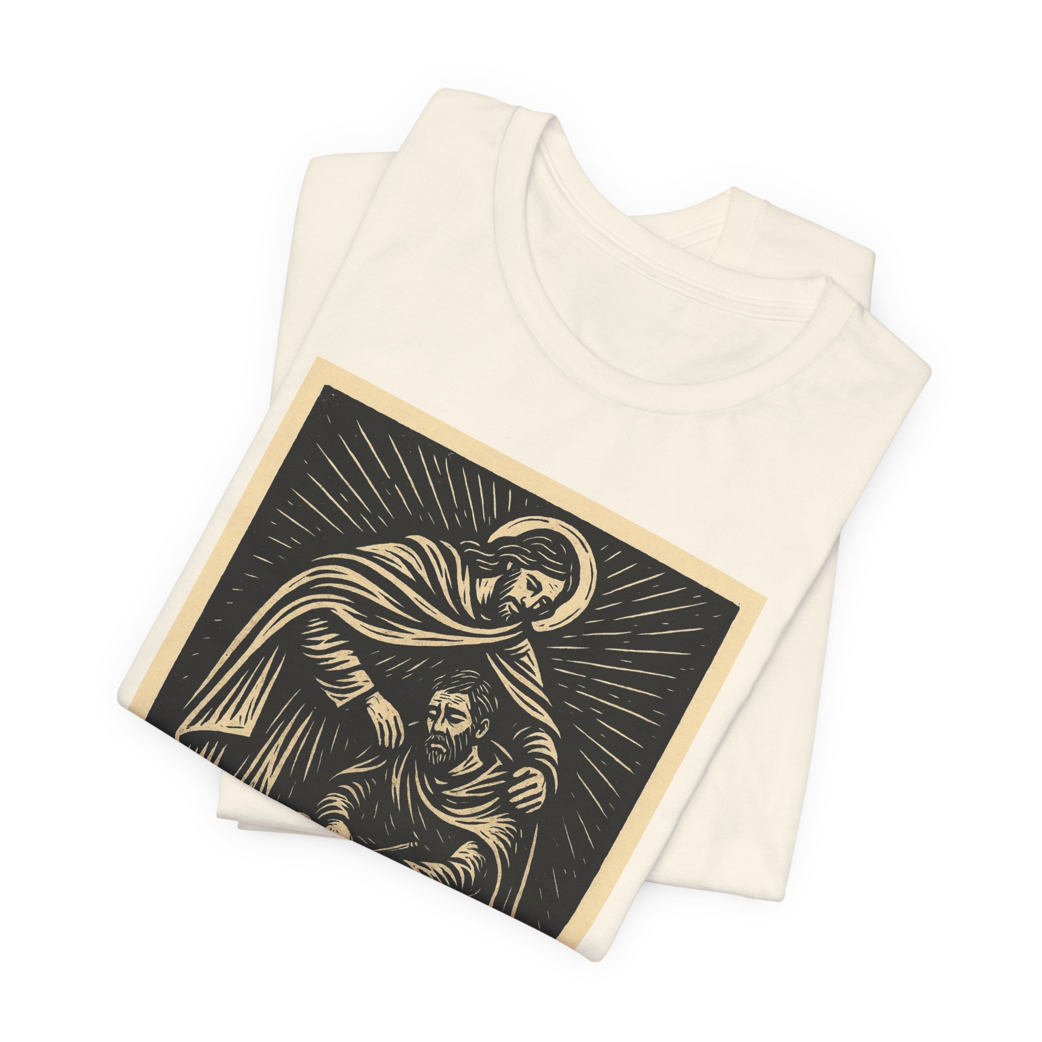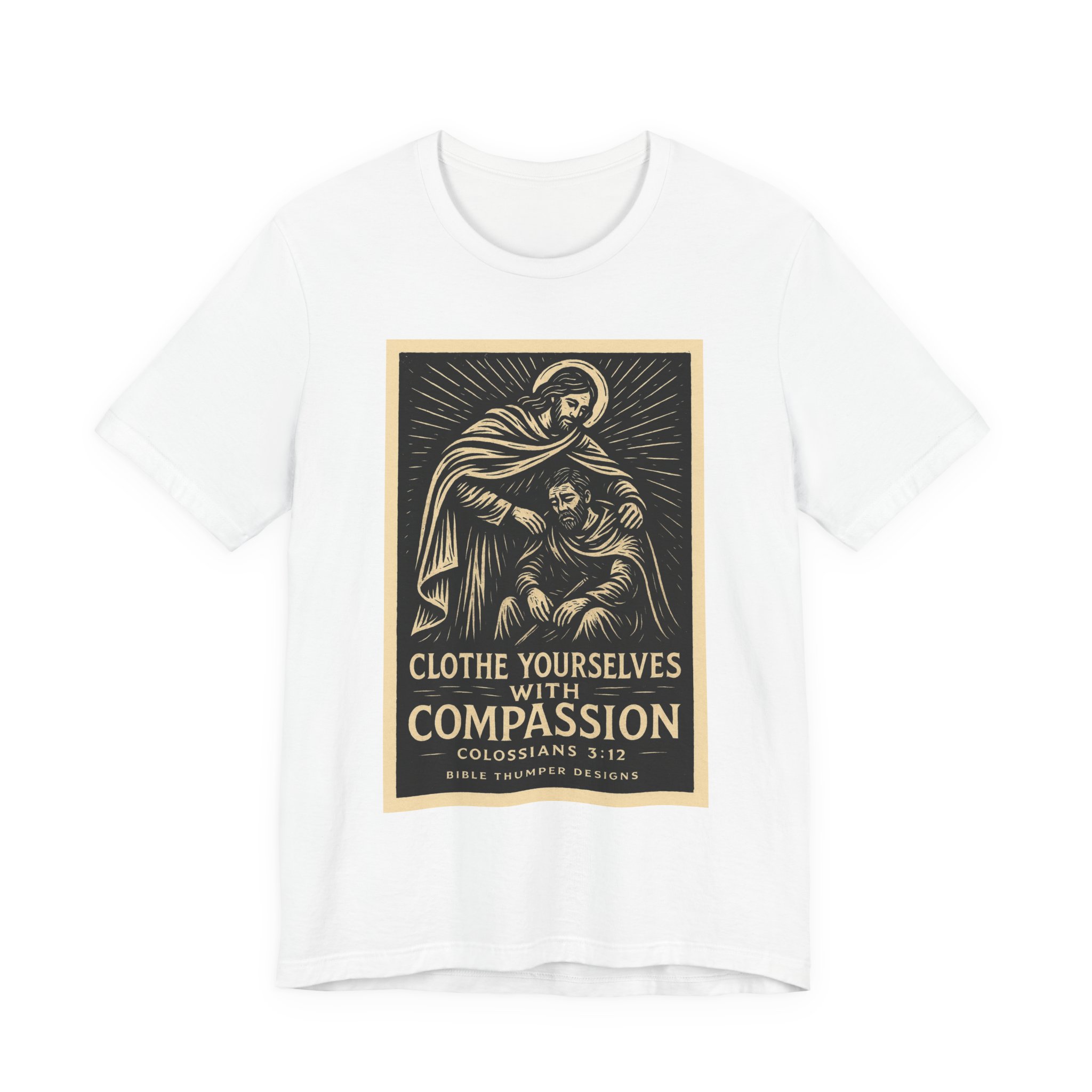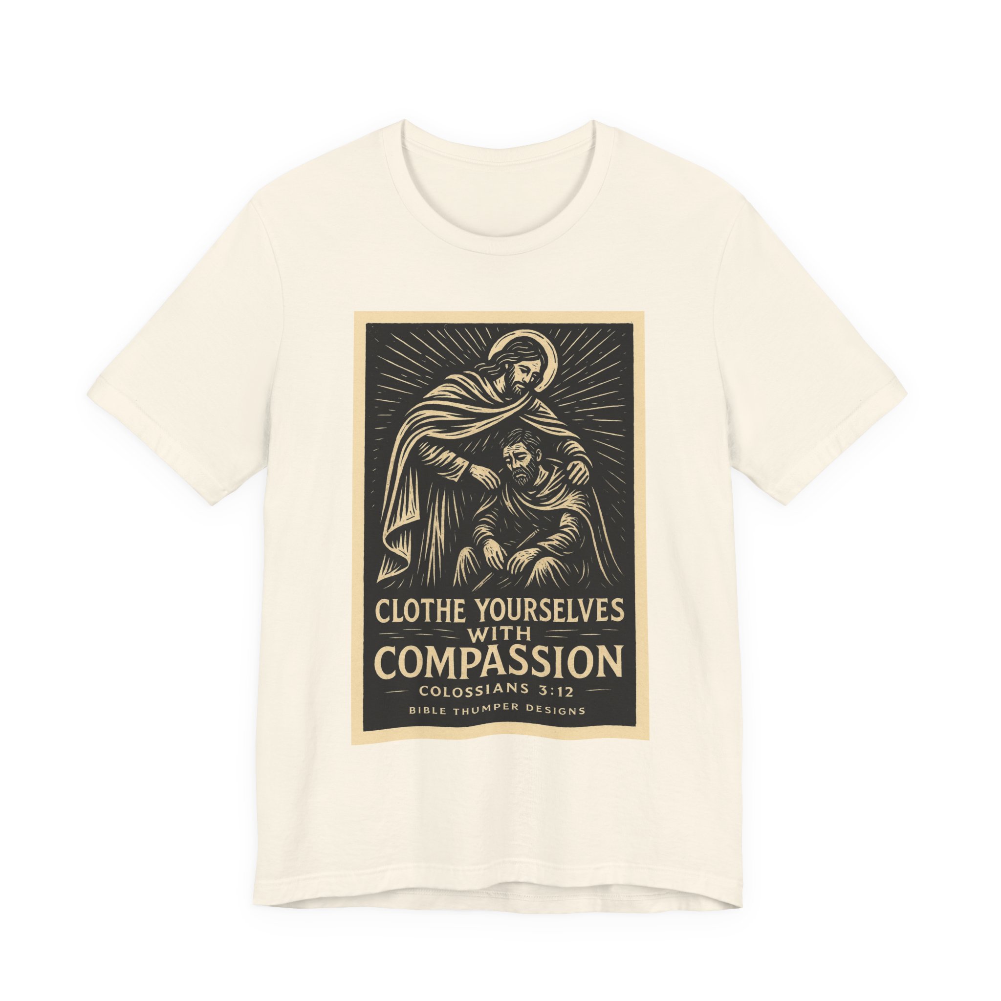 This lightweight crewneck tee carries a calm, reverent energy — a vintage-inspired religious illustration framed in warm ochre tones with the words “Clothe Yourselves with Compassion” and Colossians 3:12 beneath. Soft Airlume combed cotton keeps the fabric breathable and gentle against skin, while the retail fit and classic neckline make it easy to wear layered or alone. The artwork reads like a small devotional poster: quiet, thoughtful, and meant to invite reflection. Wear it to church gatherings, volunteer days, or when you want a subtle reminder to move through the day with empathy.