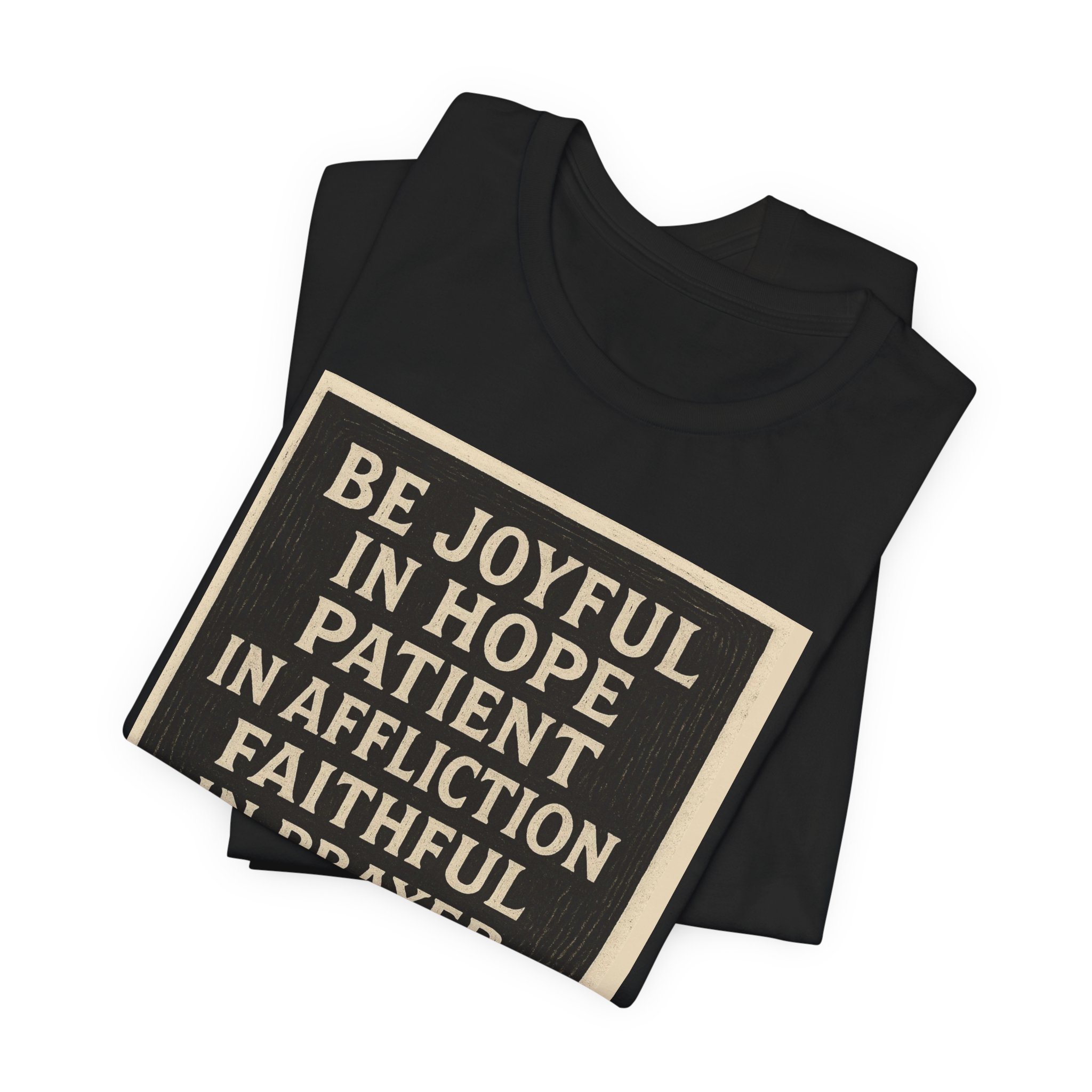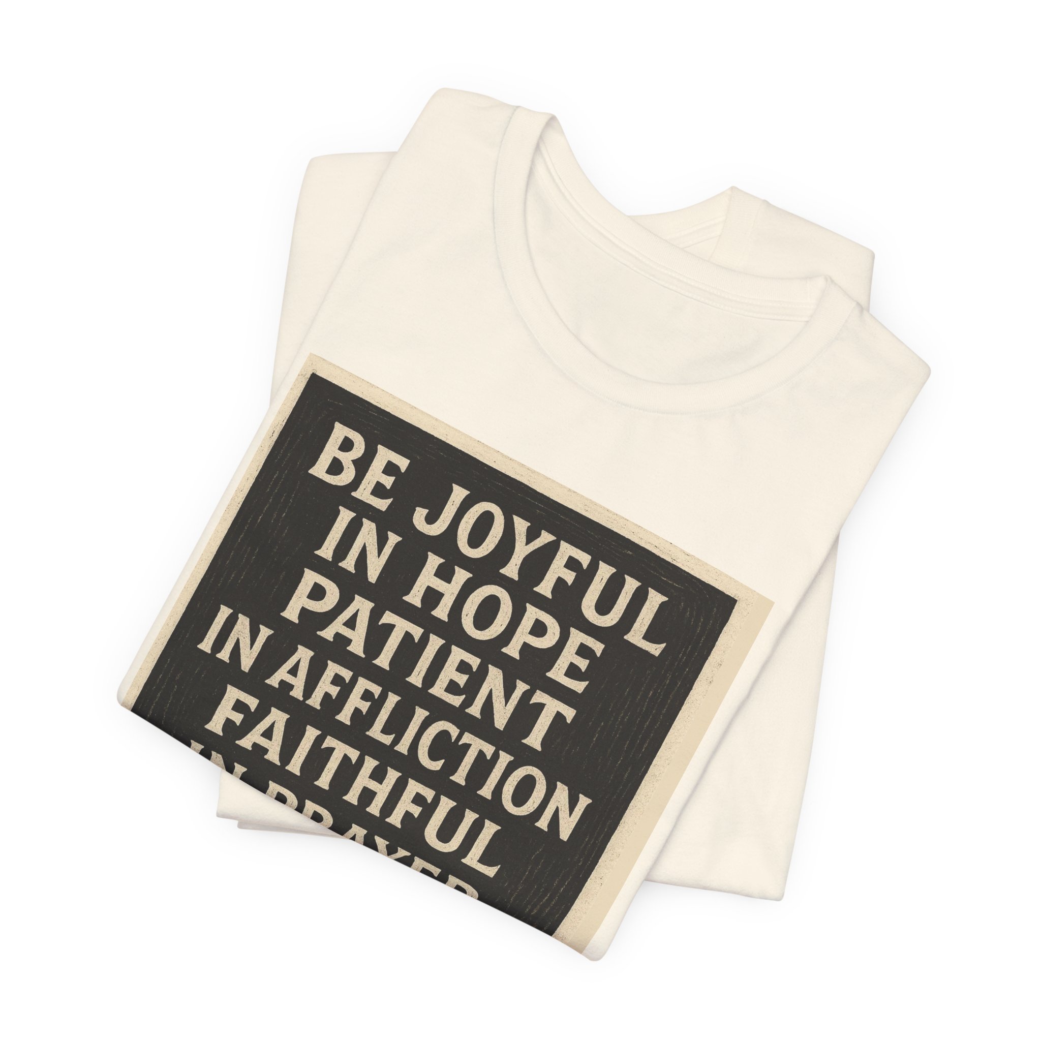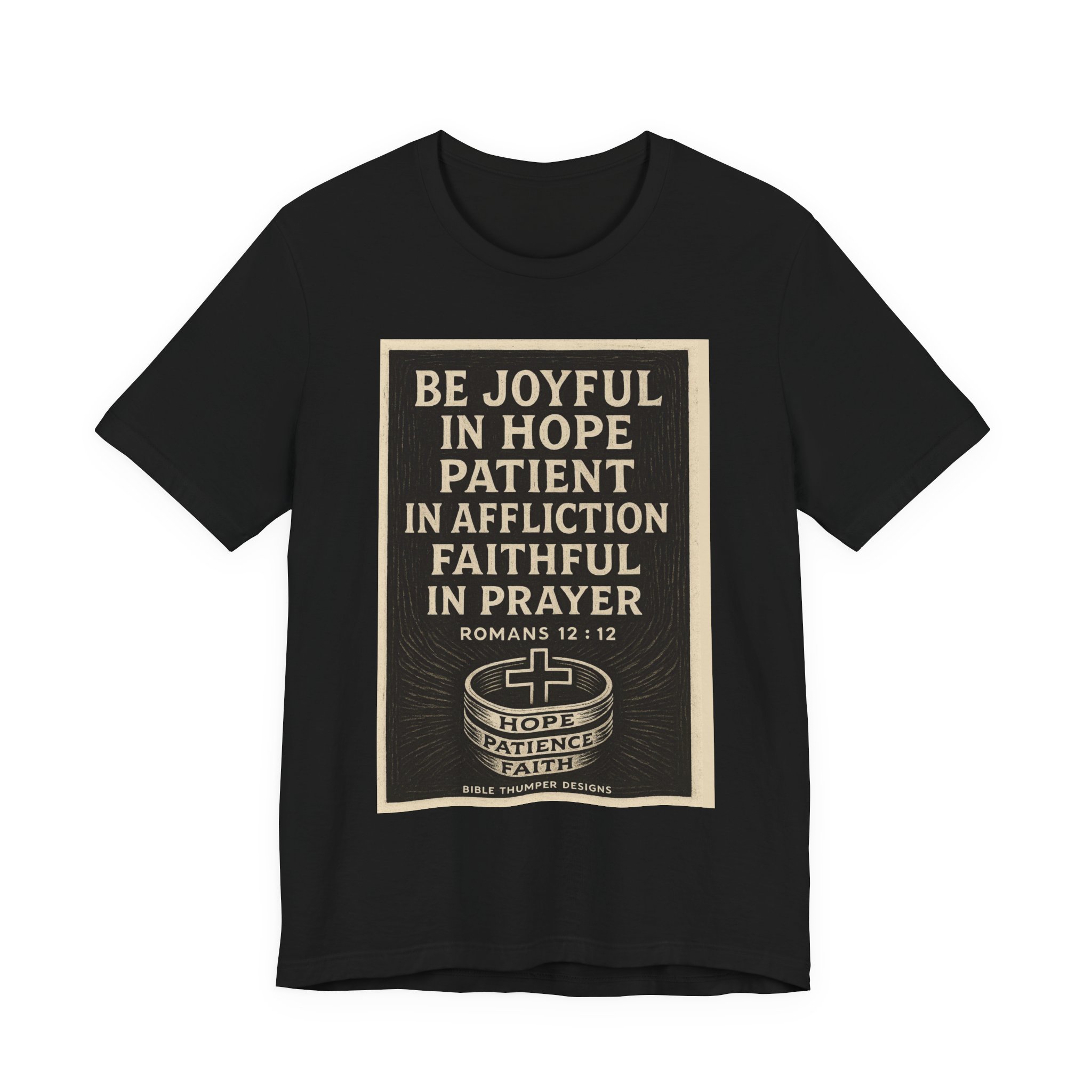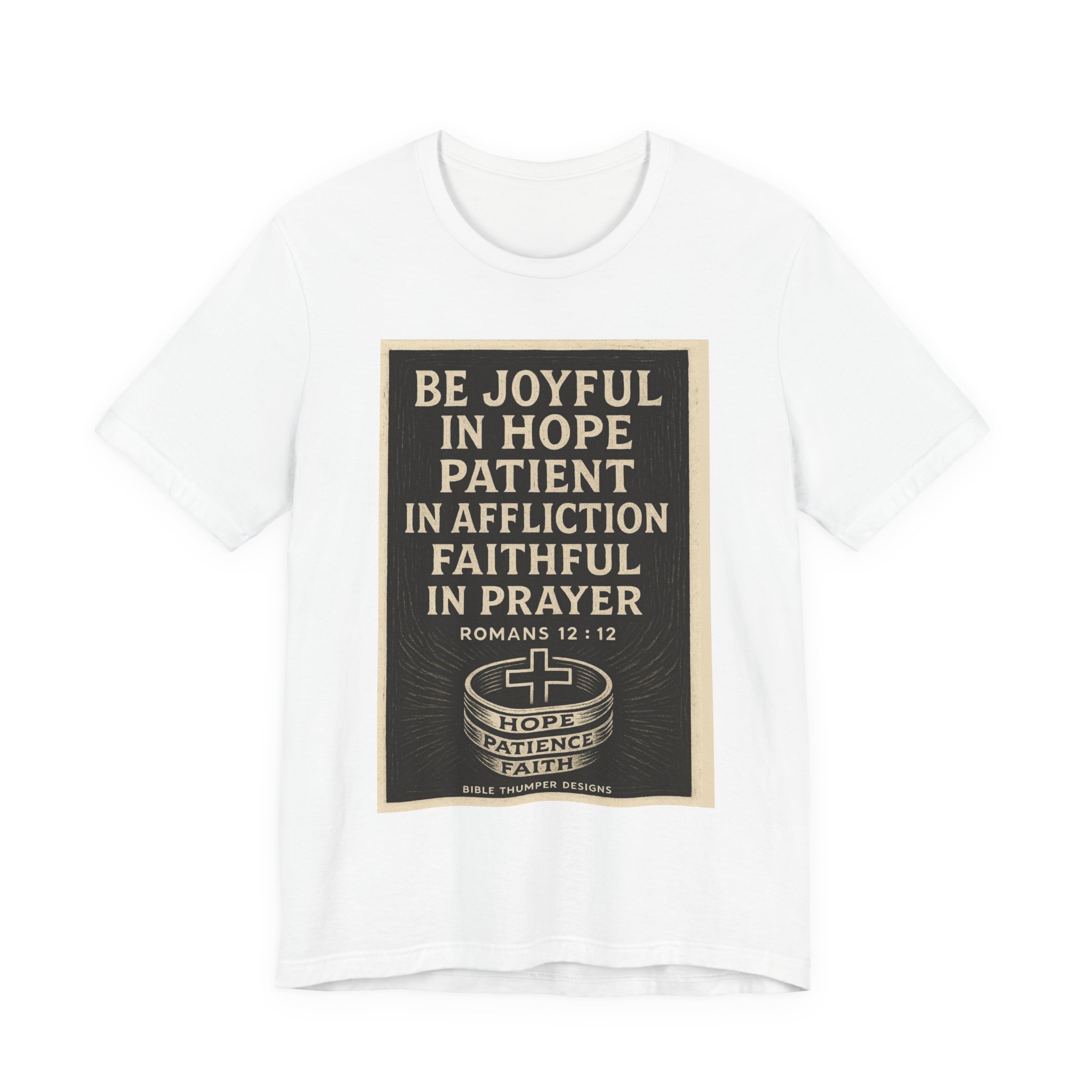 A soft, breathable tee that carries a quiet, steady message. The lightweight cotton feels gentle against the skin while the ribbed crewneck and side seams keep the shape neat wash after wash. The front print shows an uplifting script and emblem—words of hope and patience—that sit like a small reminder you can wear all day. It layers easily under jackets or stands on its own for church, volunteer days, or slow weekend mornings. This shirt reads like a wearable note of encouragement for someone who values faith, calm, and understated style.