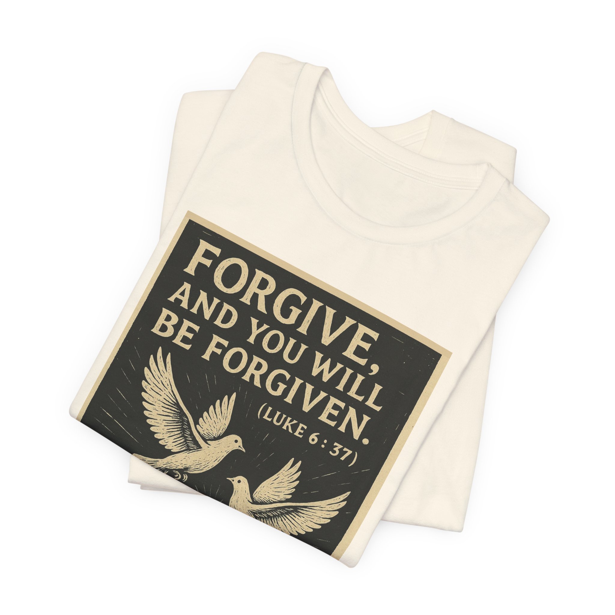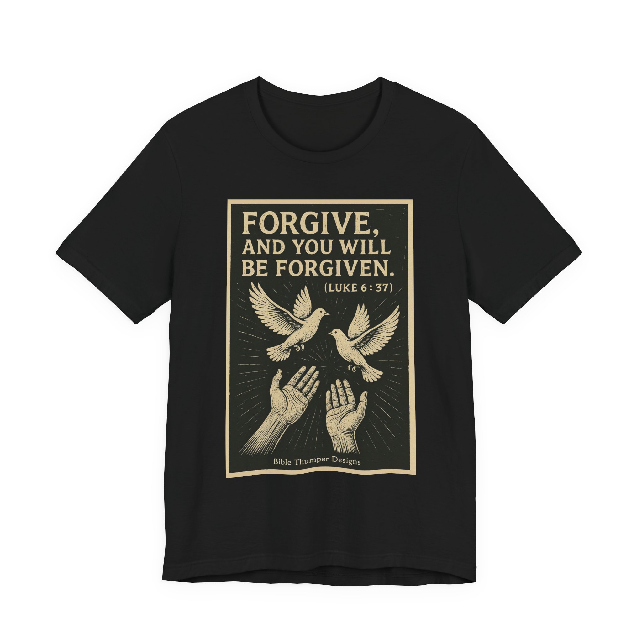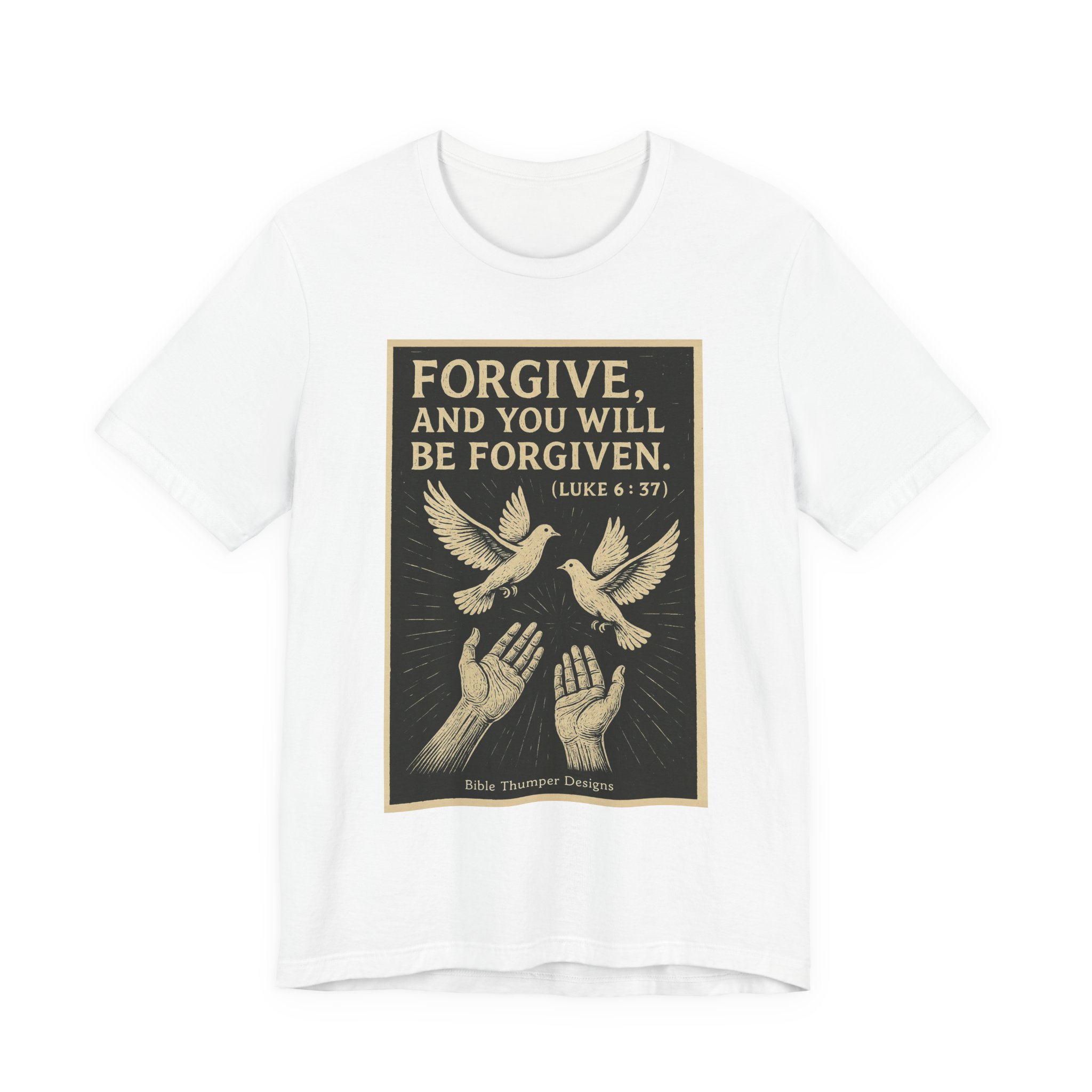 Soft, breathable cotton with a calm, faith-forward message. This lightweight tee carries a vintage-style print: outstretched hands releasing two doves beneath the verse “FORGIVE, AND YOU WILL BE FORGIVEN. (LUKE 6:37).” The muted, hand-inked illustration and warm, framed print give the shirt a reverent, contemplative feel — like a quiet moment shared between church pews and everyday life. Wear it to morning service, volunteer work, or slow Sundays when you want clothing that reflects conviction without shouting. The retail cut and crew neck layer naturally under jackets or sit comfortable on their own; tear-away label and quality stitching keep it wearable all day. Ethically produced and REACH certified, the tee pairs faithful style with responsible production.