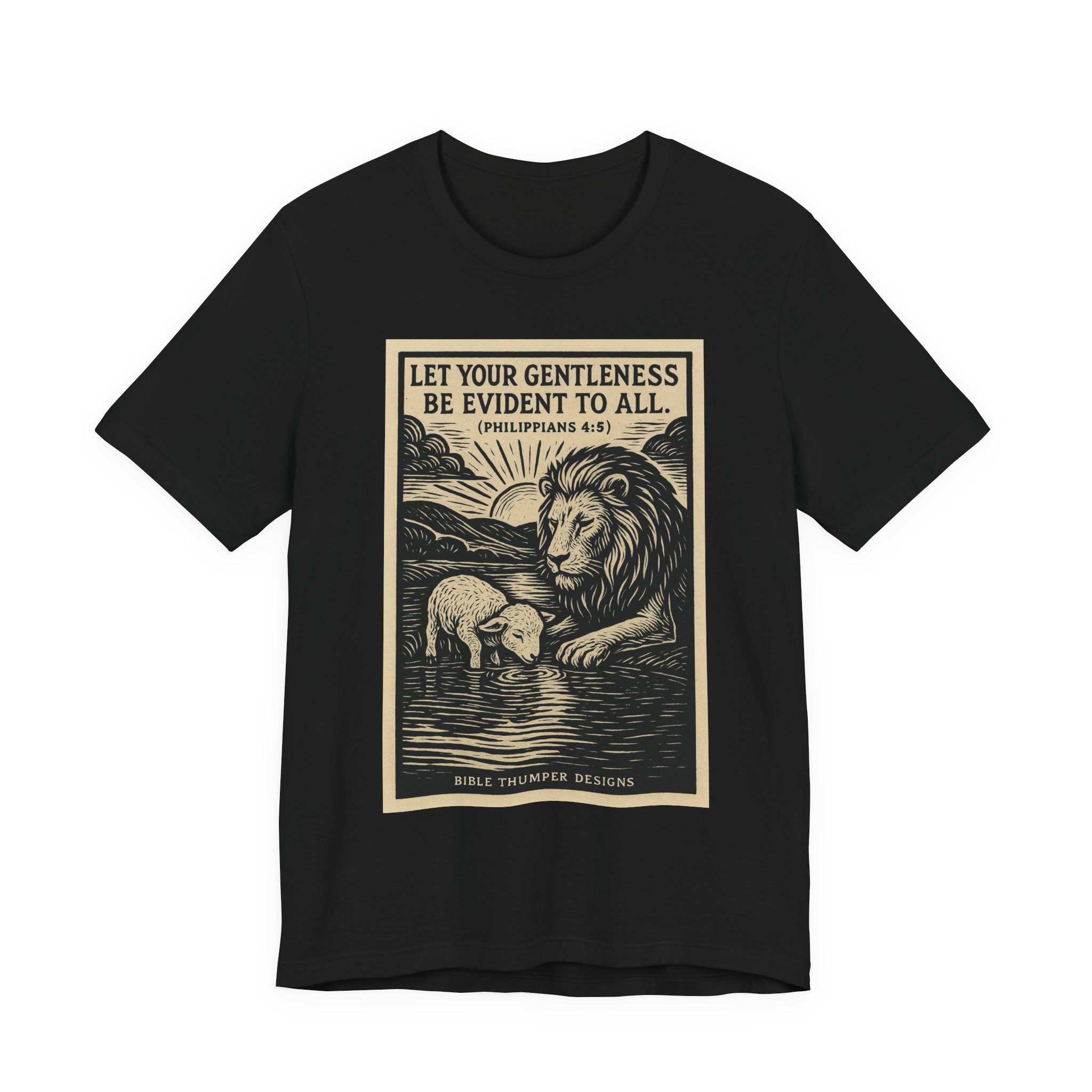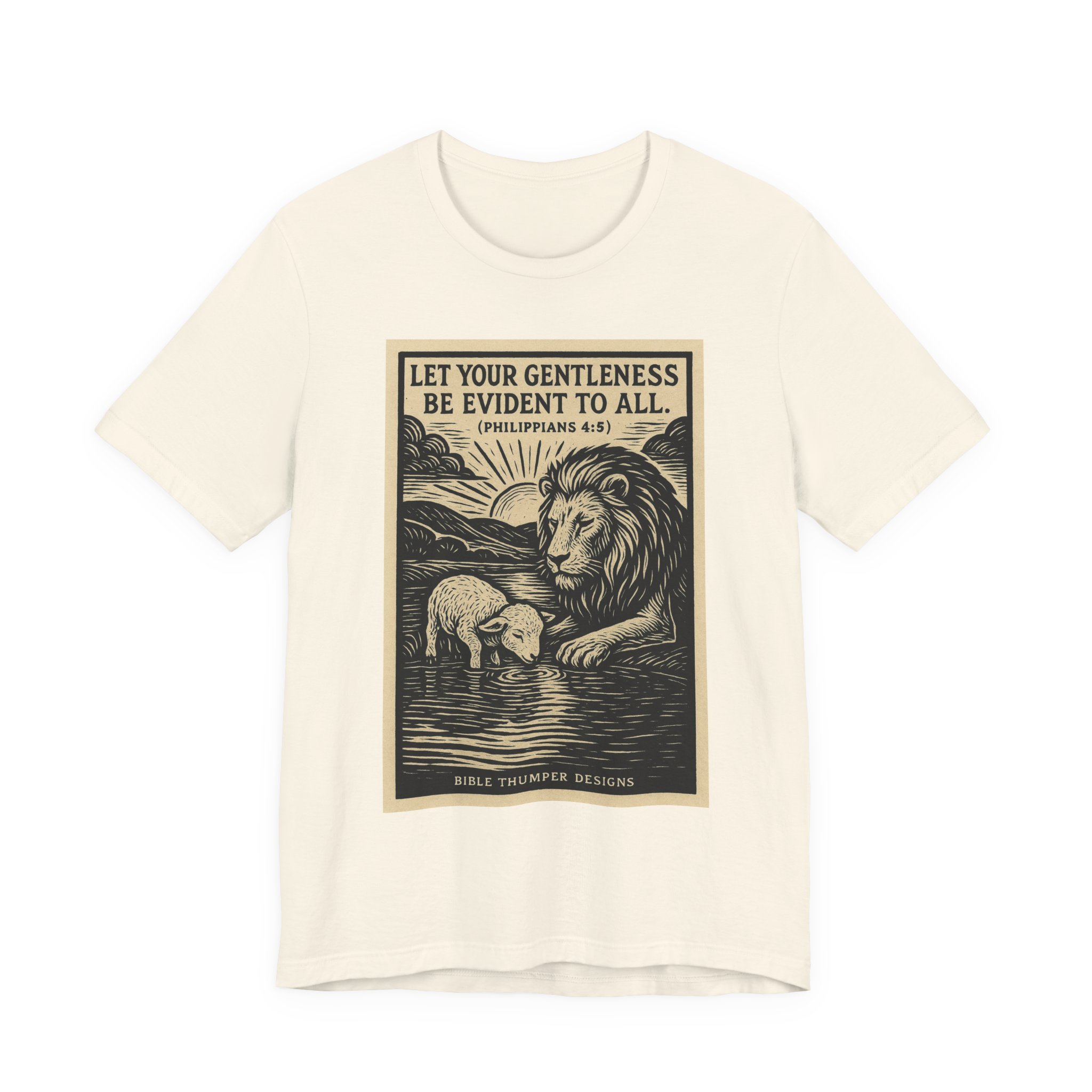 Be the first to review “Gentleness Be Evident Tee — Lion & Lamb Philippians 4:5 Christian T‑Shirt”