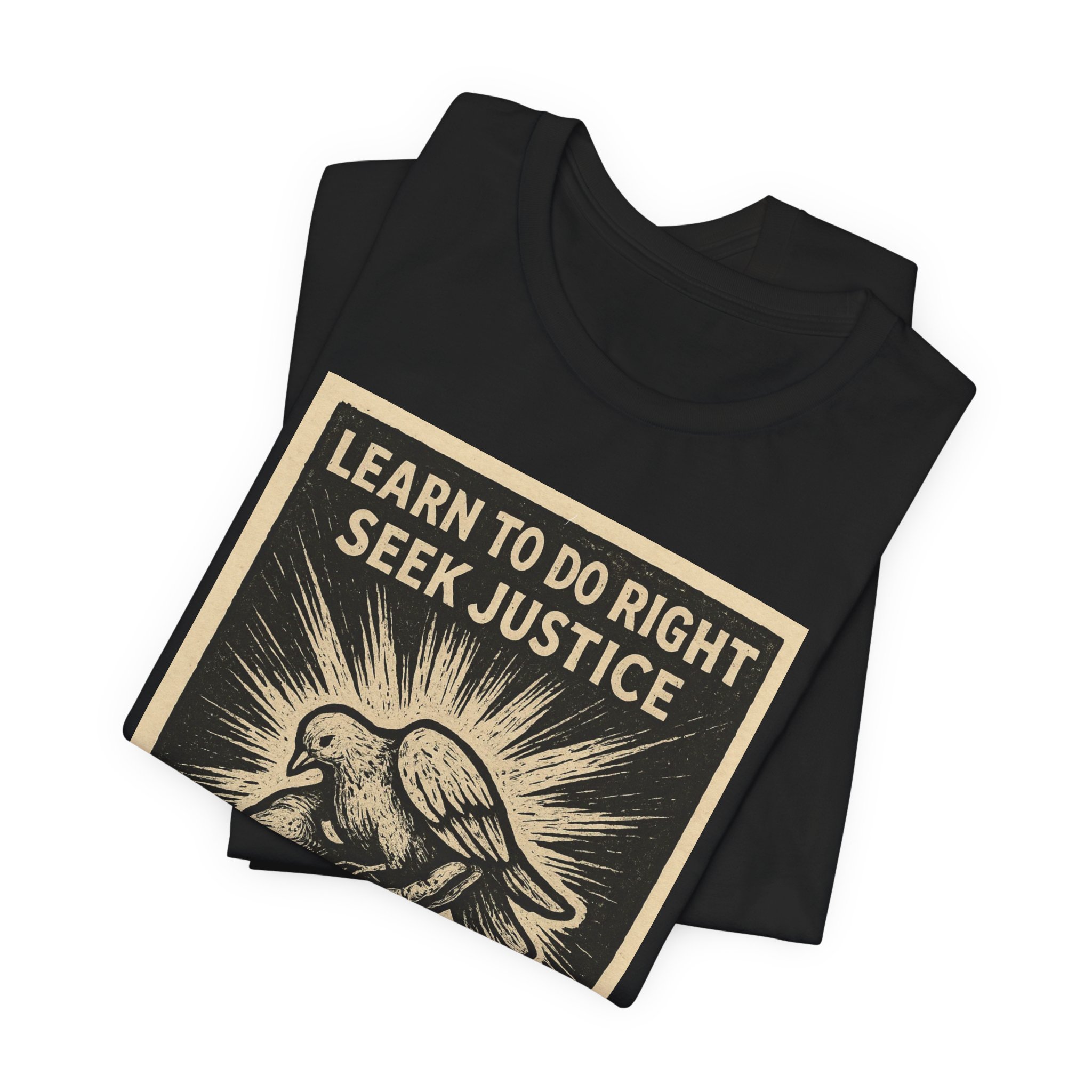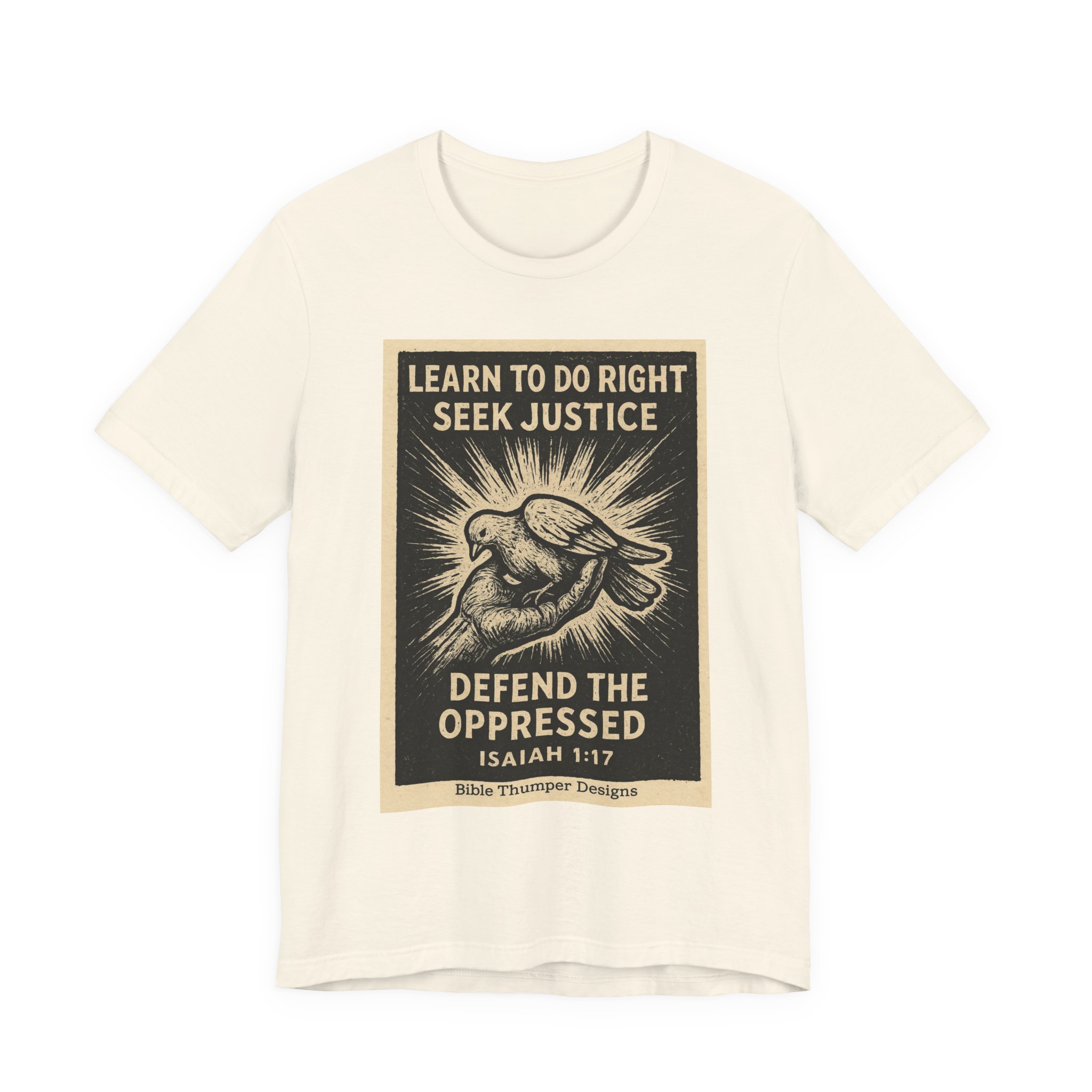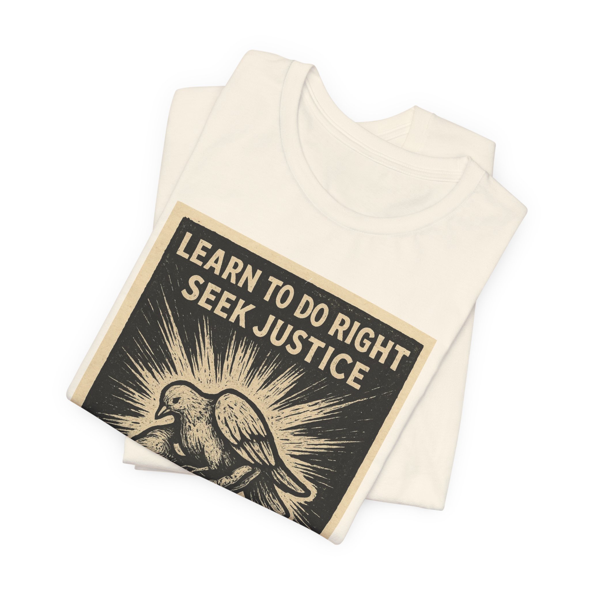 A lightweight, everyday tee that carries a quiet but powerful message. This crew-neck shirt features a vintage-style graphic of a dove and sunburst with the words “Learn to do right, seek justice — Defend the oppressed,” creating a look that feels both hopeful and determined. The soft 100% Airlume combed and ring-spun cotton body drapes easily and layers well, while the ribbed collar and shoulder tape keep the silhouette clean wash after wash. Wear it to community events, rallies, or worn-in mornings at the coffee shop — it sits comfortably through long days while doubling as a thoughtful conversation starter.