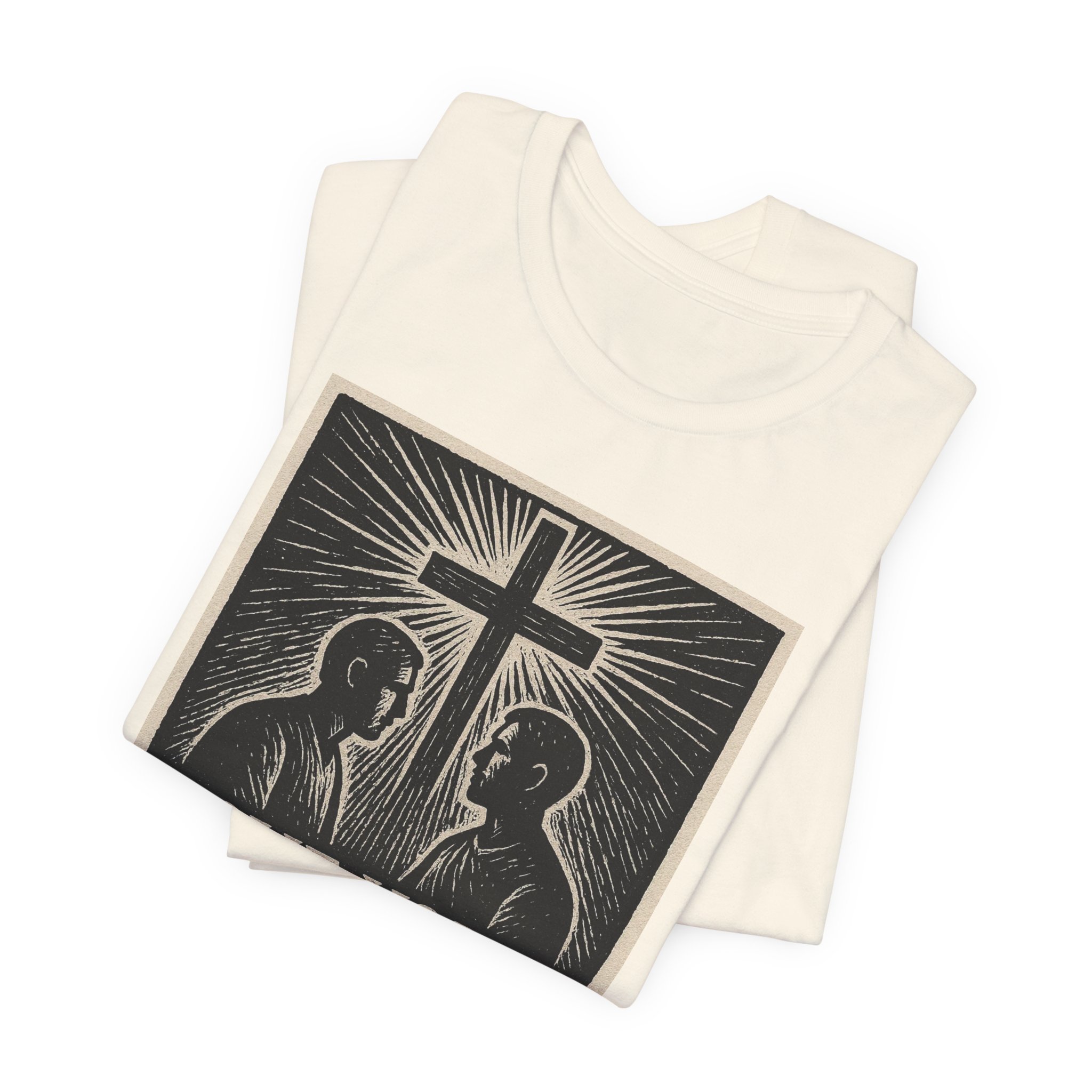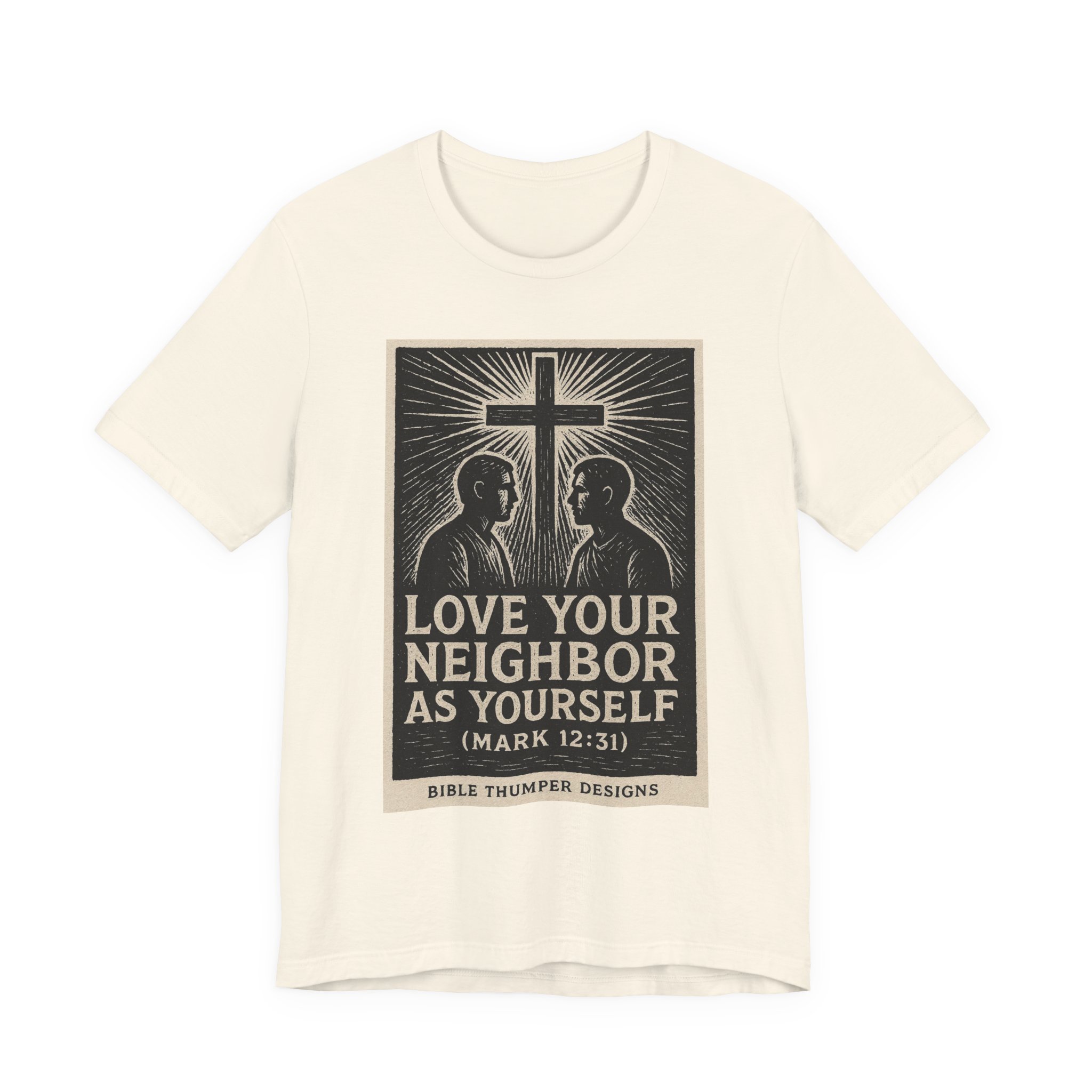 A soft, breathable jersey tee built for everyday wear that carries a quiet, faith-forward message. The front art features a vintage woodcut-style illustration: two figures facing each other beneath a radiant cross, with the words “Love Your Neighbor As Yourself (Mark 12:31)” rendered in bold, hand-lettered type. The shirt’s lightweight Airlume combed and ring-spun cotton keeps the print feeling crisp without stiffness, while the retail crew neckline and side seams keep the silhouette neat and comfortable for layering or wearing on its own. This tee feels like a calm invitation — to reflect, to live your values out loud, and to start conversations where they matter.