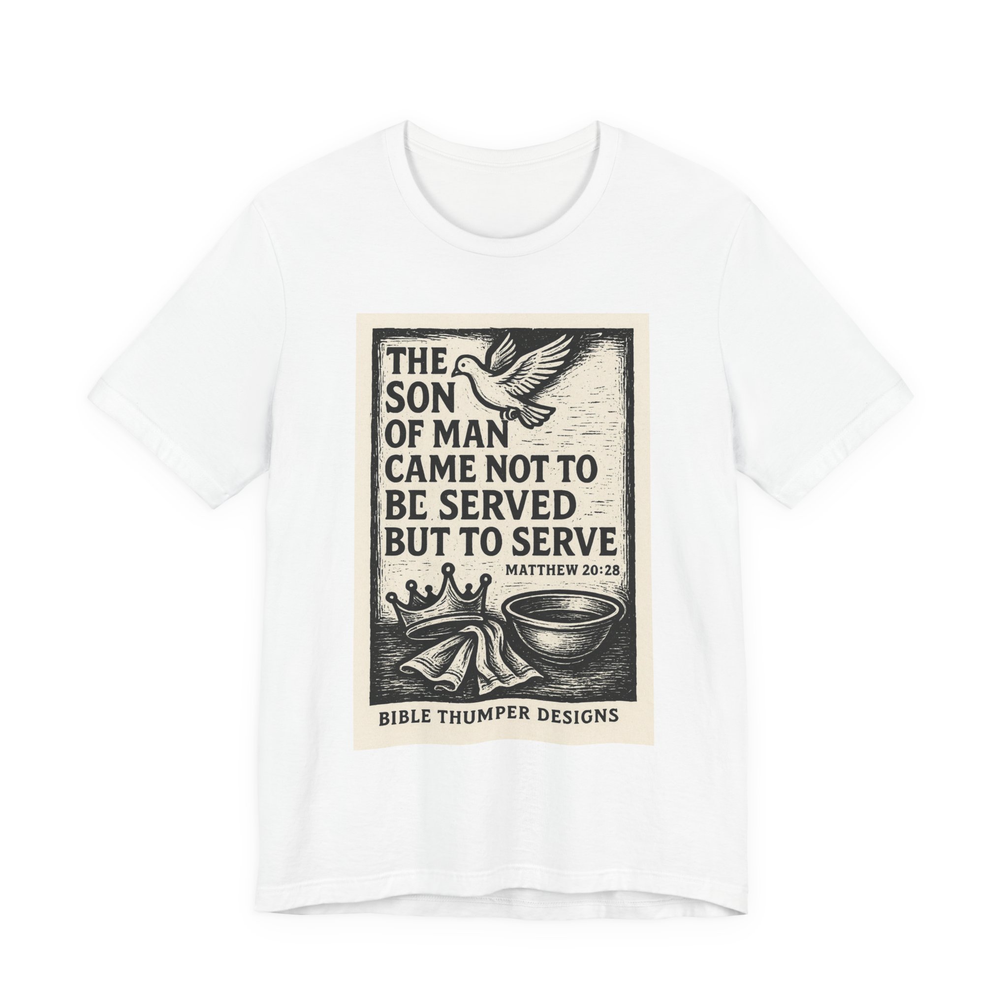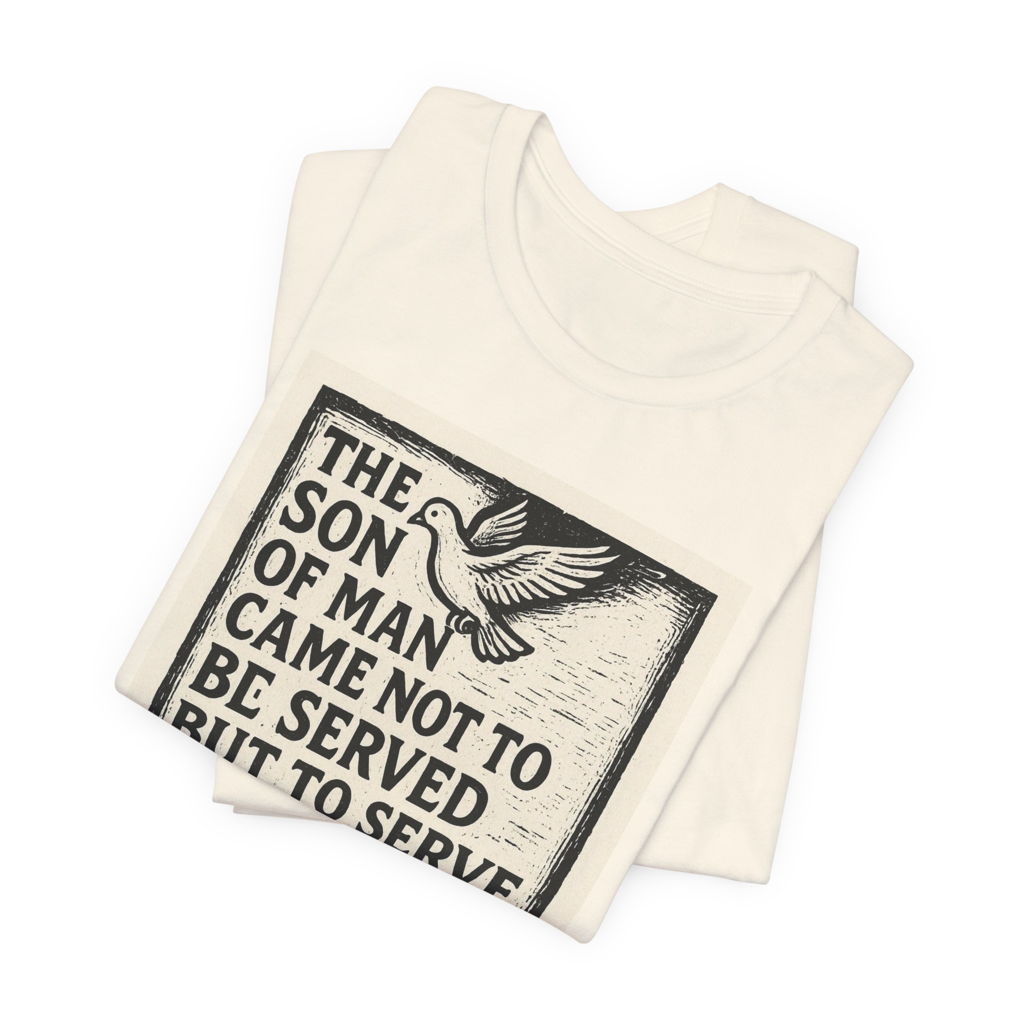 This lightweight crew-neck tee carries a quiet, devotional energy — a soft, breathable canvas for a vintage-style scripture print. The front artwork quotes Matthew 20:28 with an illustrated dove, crown and bowl, in a distressed ink look that feels like an heirloom poster. Wear it to church events, volunteer days, or slow Sunday mornings: it layers easily, holds its shape, and lets the message speak without fuss. Crafted for everyday movement, it feels worn-in from the first wear and pairs naturally with jeans, a cardigan, or a utility jacket.