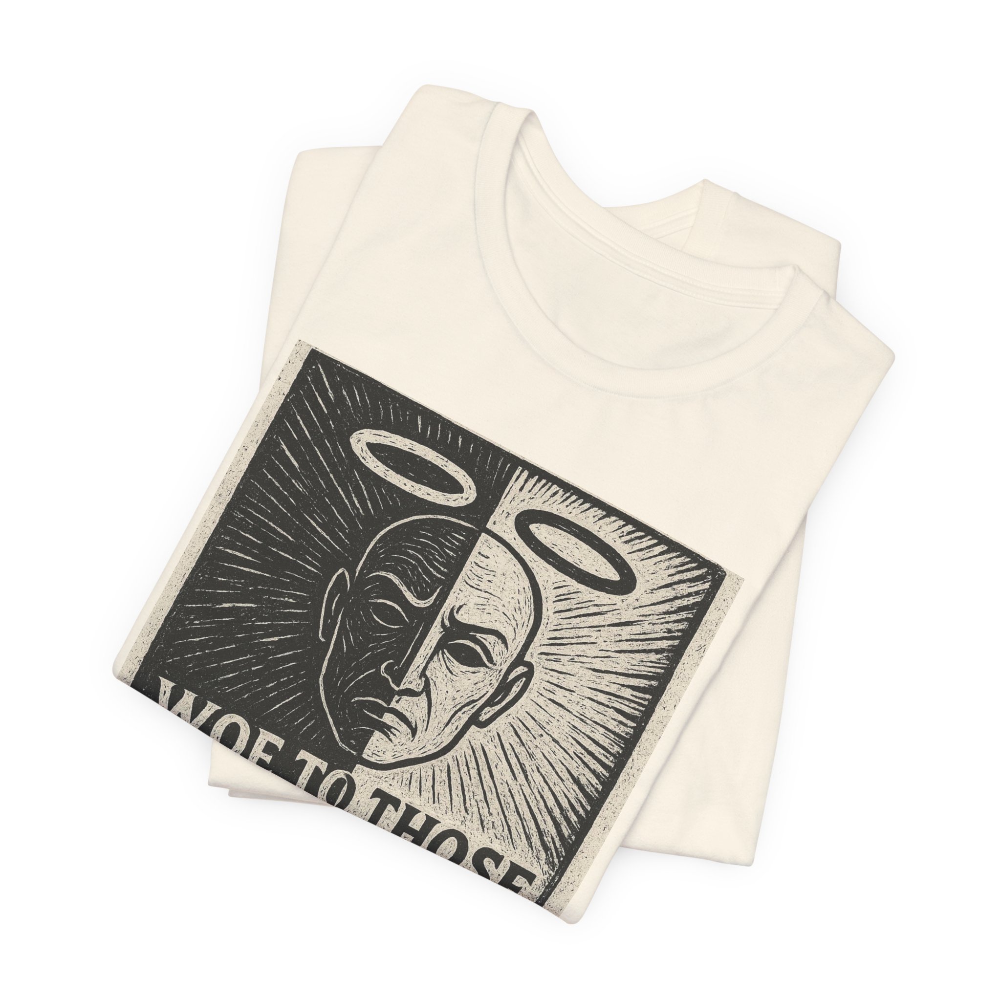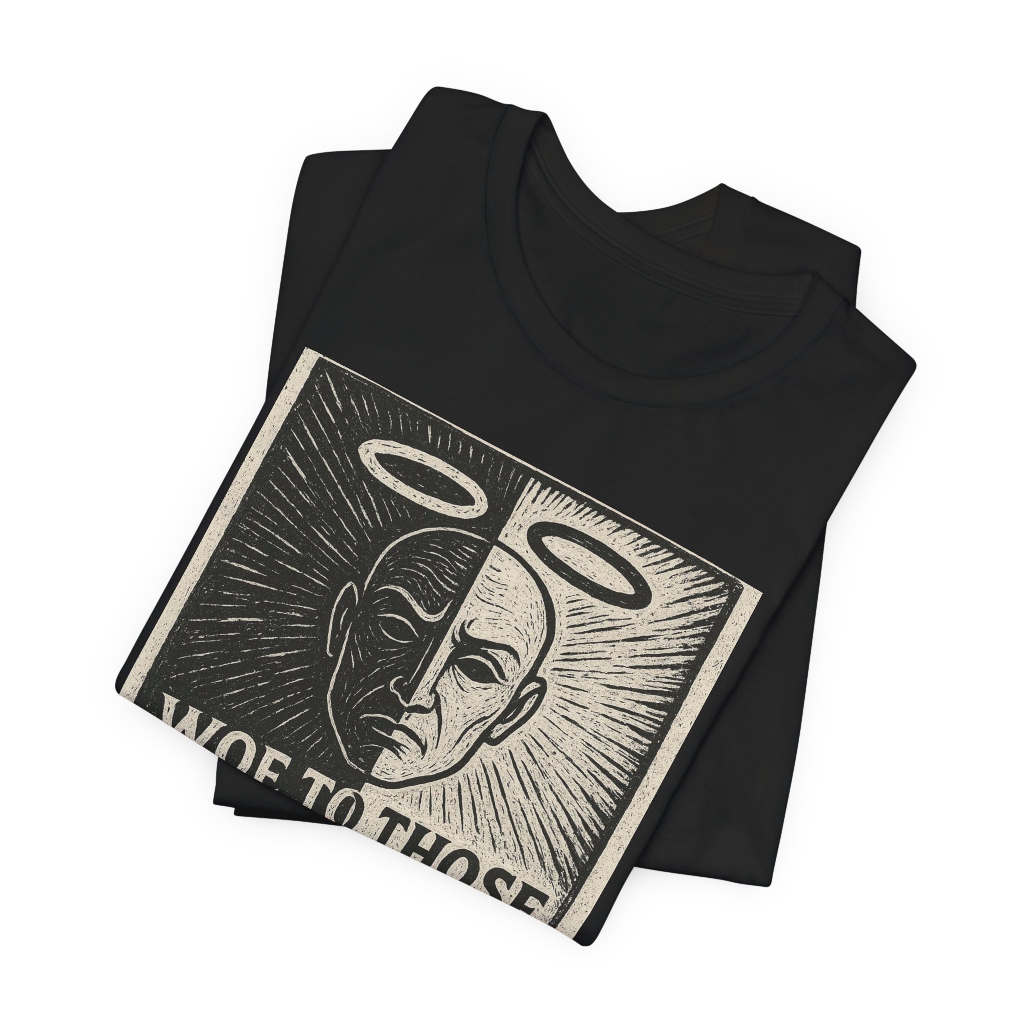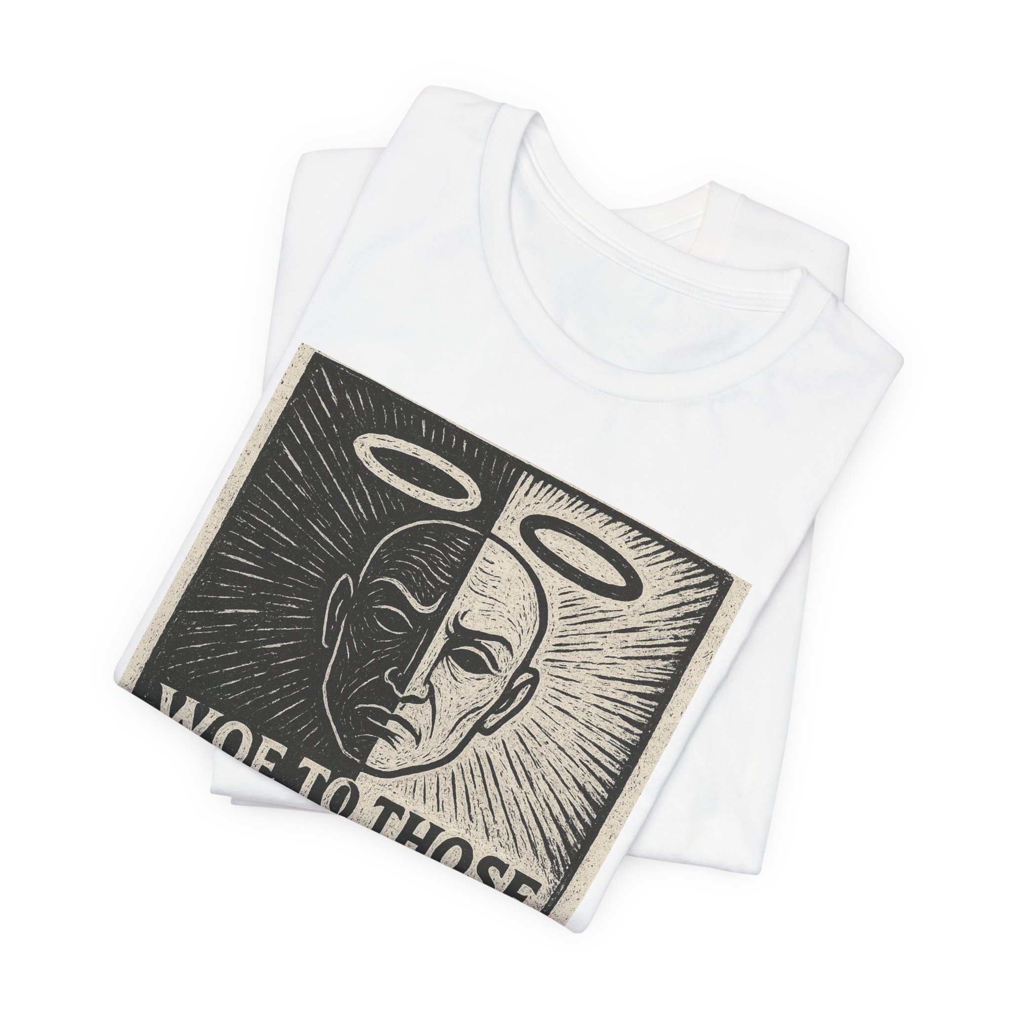 This lightweight jersey tee carries a bold, thought-provoking graphic that reads “Woe to those who call evil good and good evil” (Isaiah 5:20). The front artwork uses a high-contrast, woodcut-style illustration divided down the middle — one side haloed and the other shadowed — giving the shirt a vintage print feel with modern edge. Breathable Airlume combed and ring-spun cotton makes it comfortable for all-day wear, while the retail crew fit keeps the silhouette neat for layering or solo styling. Ethically made and REACH-certified, the tee blends meaningful messaging with responsible production. Wear it to spark conversation, reflect personal convictions, or add a striking graphic layer to everyday outfits.